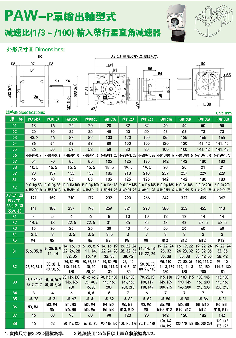 多样化:输出轴种类多样化,有单出力轴型、双出力轴型、中空轴型、中空法兰型、中空轴锥形紧迫性、螺杆直线型、螺牙直线型。
