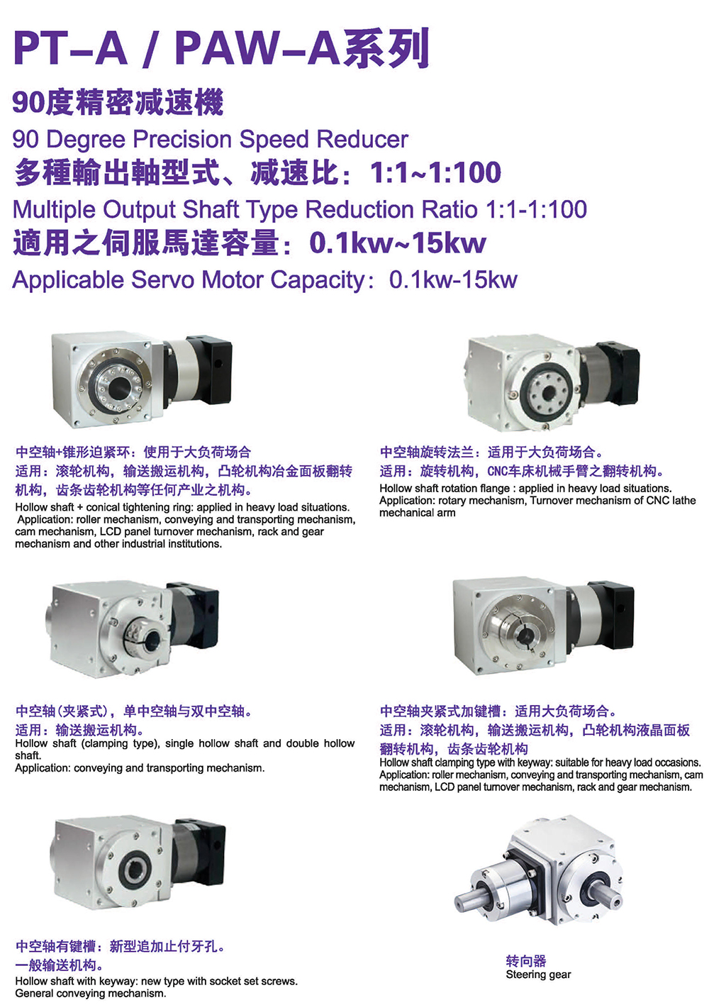 多样化:输出轴种类多样化,有单出力轴型、双出力轴型、中空轴型、中空法兰型、中空轴锥形紧迫性、螺杆直线型、螺牙直线型。