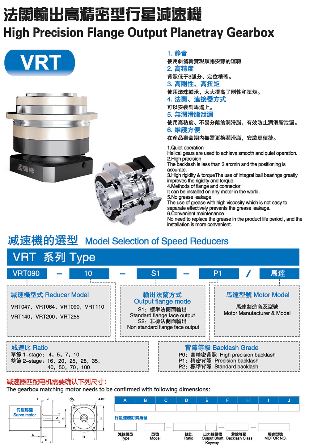 1. 高精度 背隙低于3分、定位精确。 2. 高刚性,高扭矩 使用整体式滚针轴承,大大提高了刚性和扭矩。 3. 高负载容量 主轴承采用锥形滚针轴承,实现高负载容量。 4. 无润滑脂泄露 使用高粘度,不易分离的润滑脂,有效防止润滑脂泄露。 5. 维护方便 在产品寿命期内无需更换润滑脂,安装更便捷。