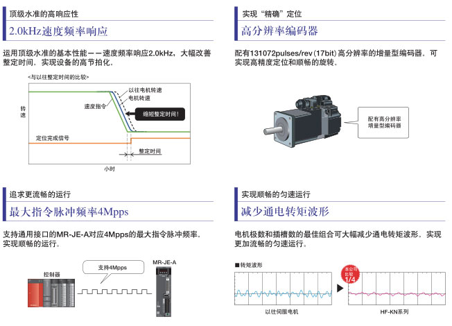 速度频率响应2.0kHz,同类等级中的性能。三菱伺服“MELSERVO-JE”以备受推崇的“一键式调谐”功能,进一步完善其易用性。