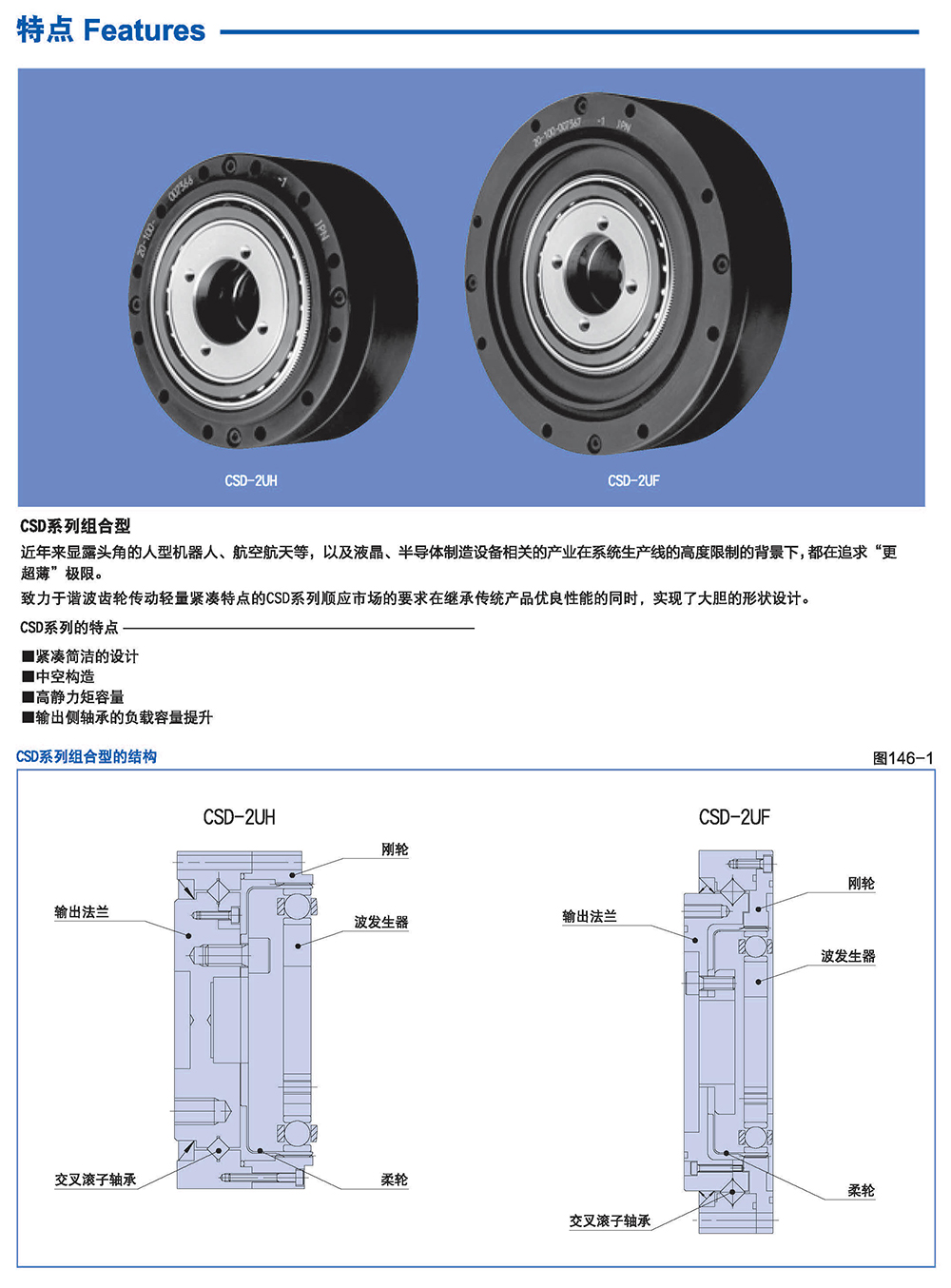 致力于谐波齿轮传动轻量紧凑特点的CSD系列顺应市场的要求在继承传统产品优良性能的同时,实现了大胆的形状设计。