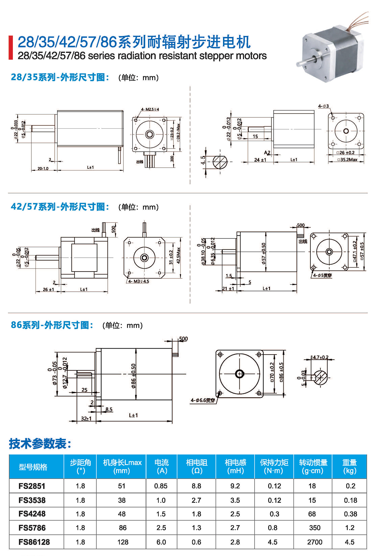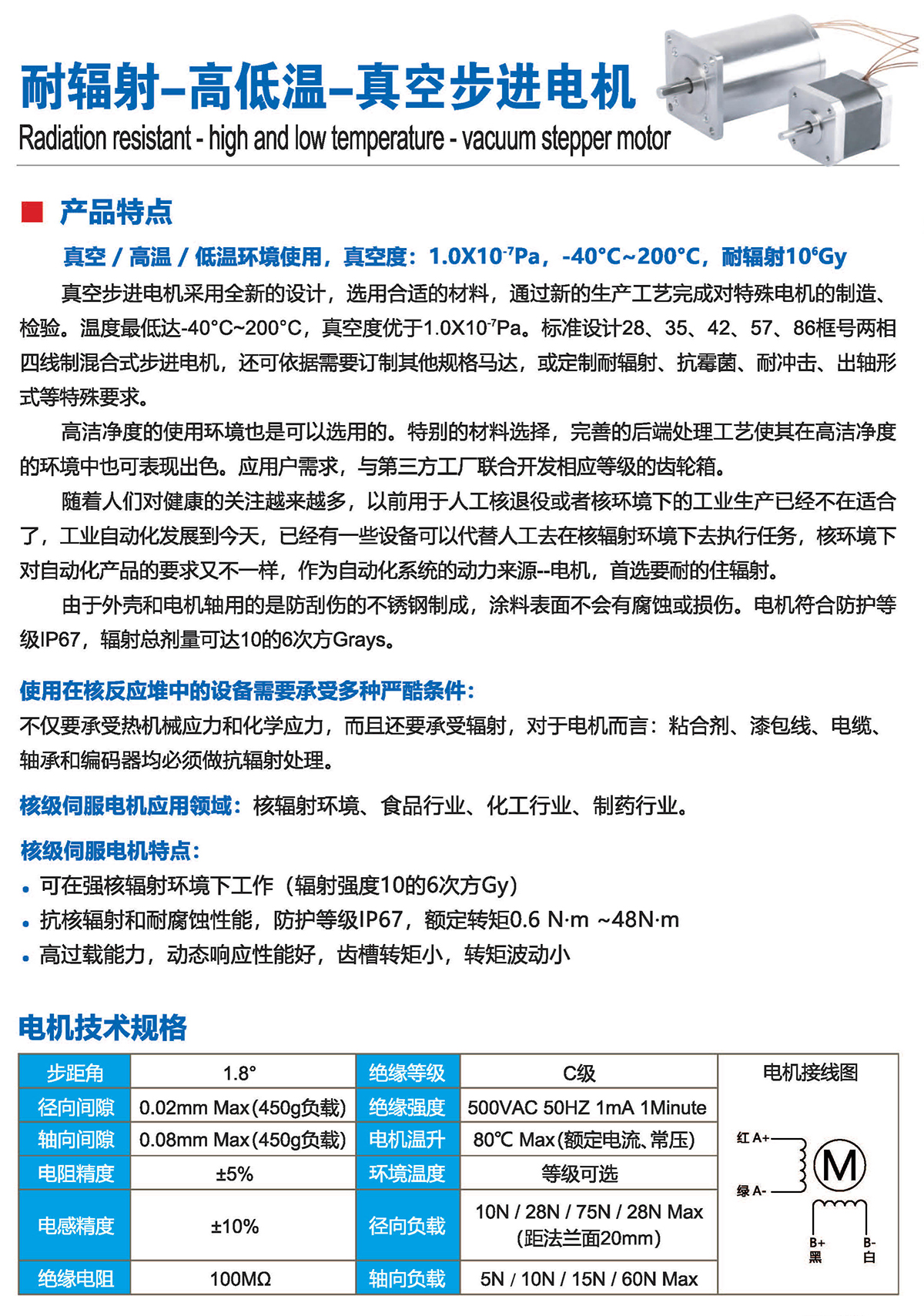 真空步进电机采用全新的设计,选用合适的材料,通过新的生产工艺完成对特殊电机的制造、检验。温度最低达-40°℃~200°C,真空度优于1.0X107Pa。标准设计28、35、42、57、86框号两相四线制混合式步进电机,还可依据需要订制其他规格马达,或定制耐辐射、抗霉菌、耐冲击、出轴形式等特殊要求。