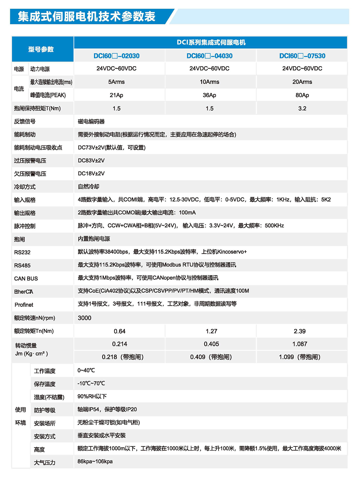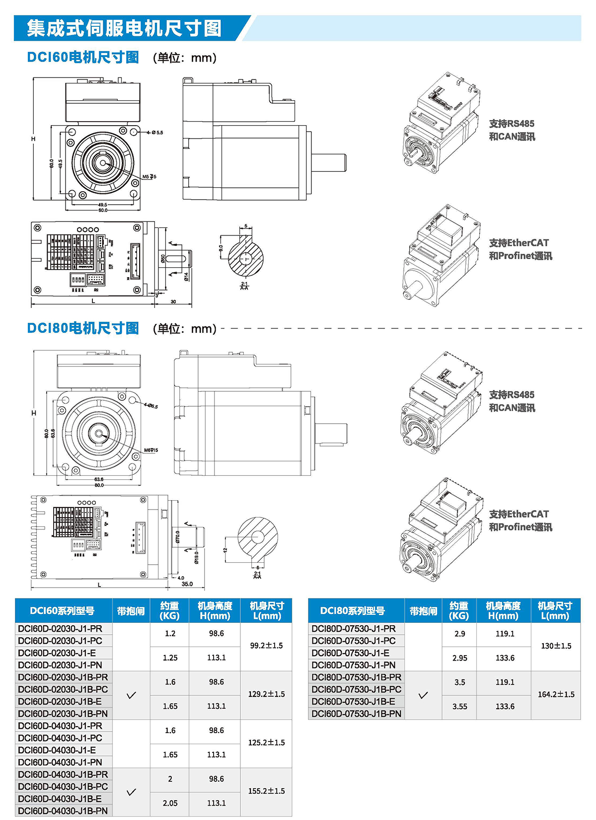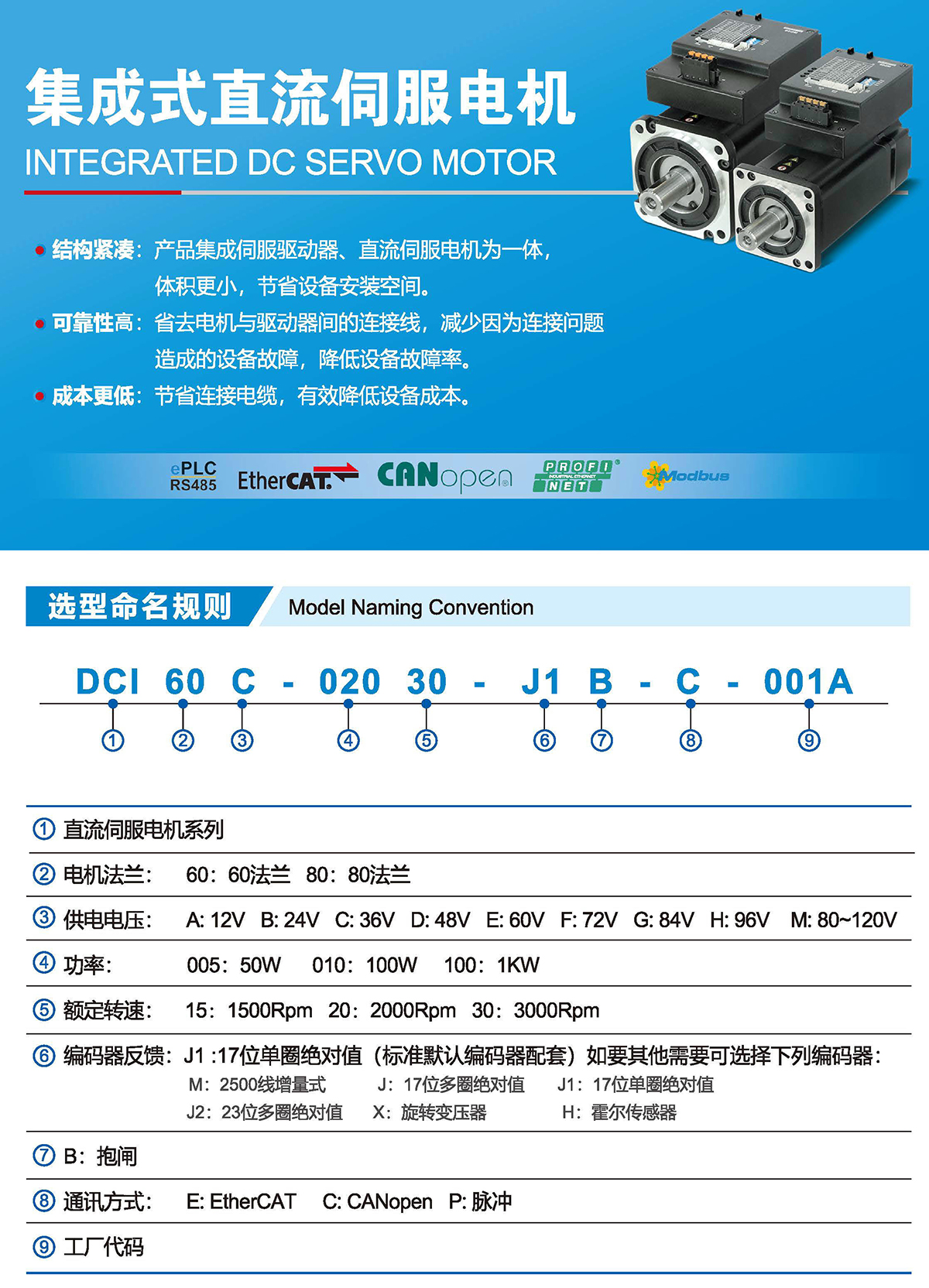 结构紧凑:产品集成伺服驱动器、直流伺服电机为一体,体积更小,节省设备安装空间。