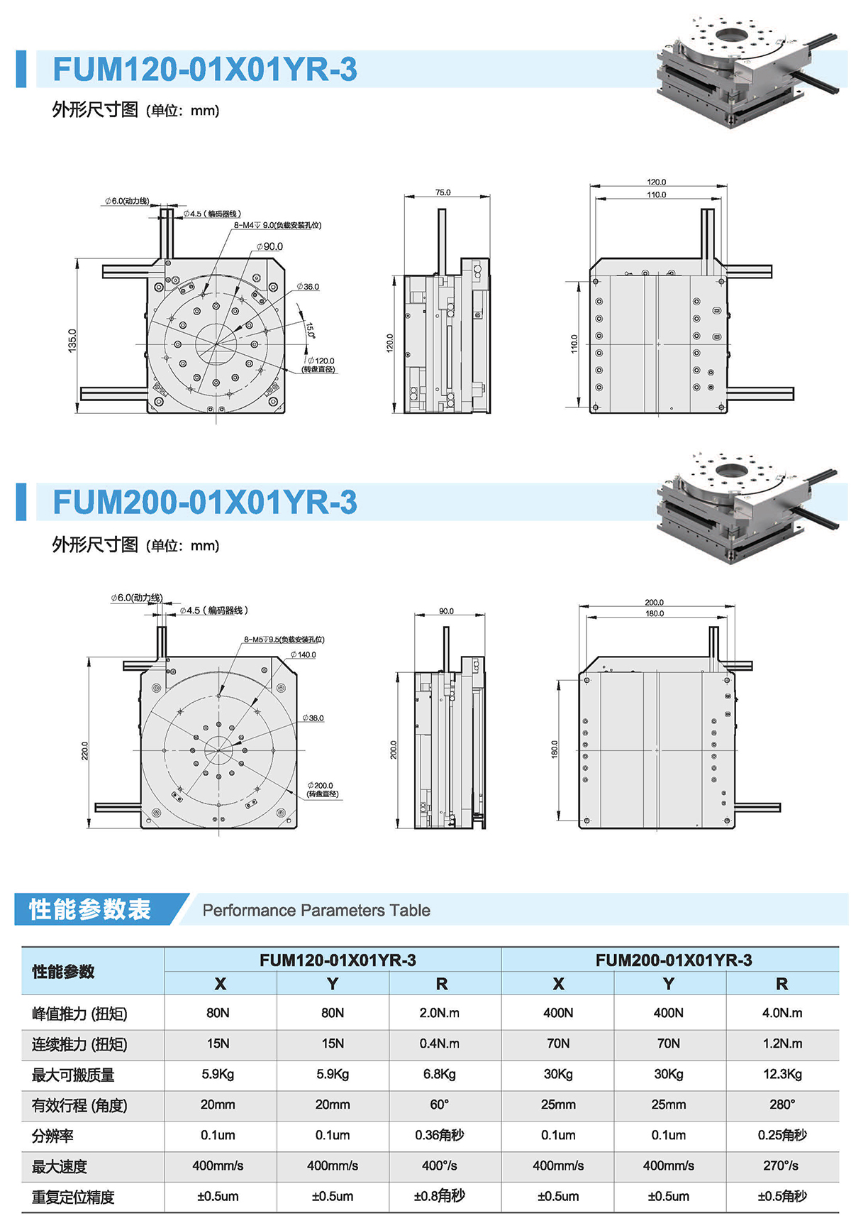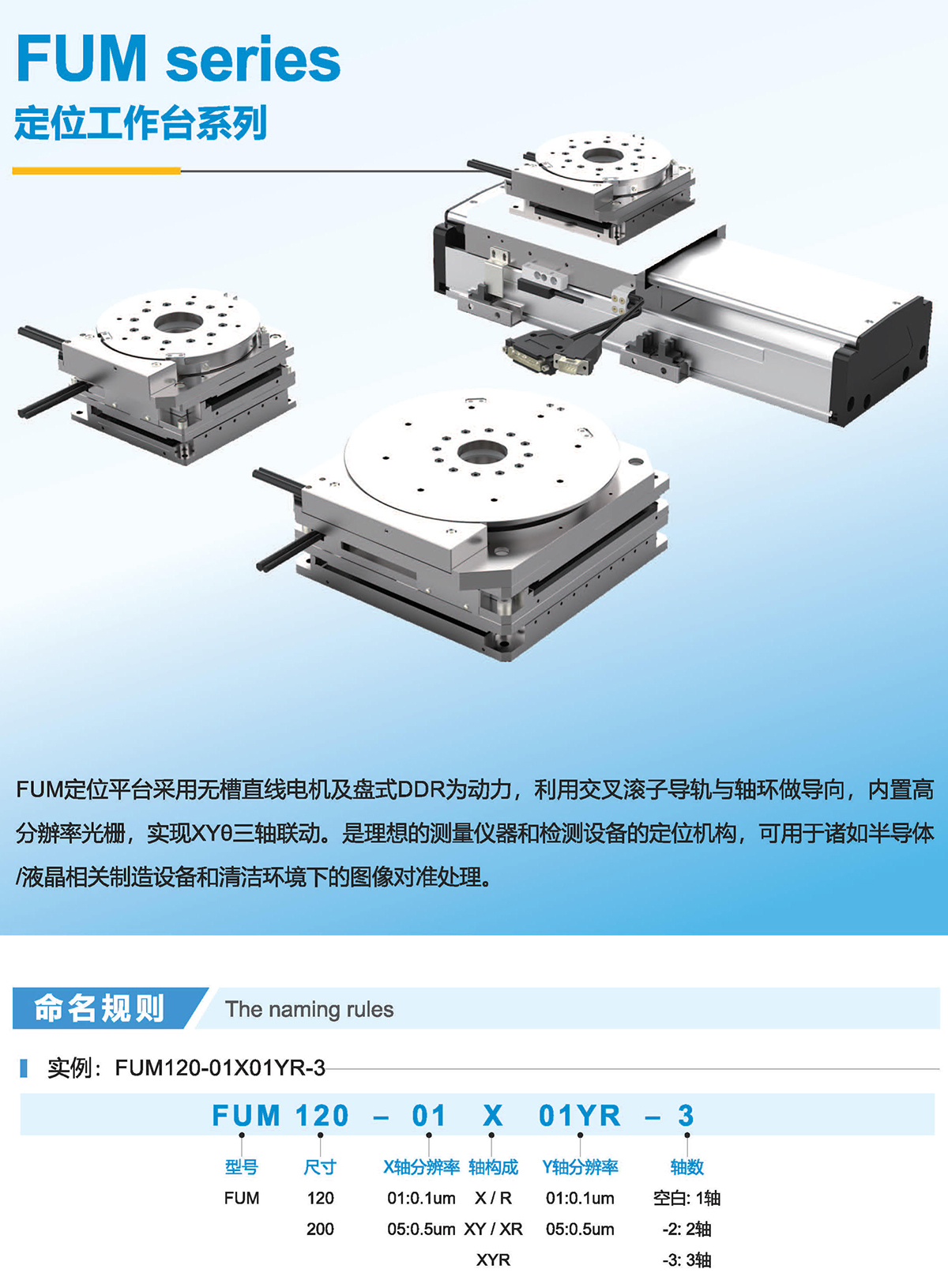 FUM定位平台采用无槽直线电机及盘式DDR为动力,利用交叉滚子导轨与轴环做导向,内置高分辦率光栅,实现XY0三轴联动。是理想的测量仪器和检测设备的定位机构,可用于诸如半导体/液相关制造设备和清洁环境下的图像对准处理。